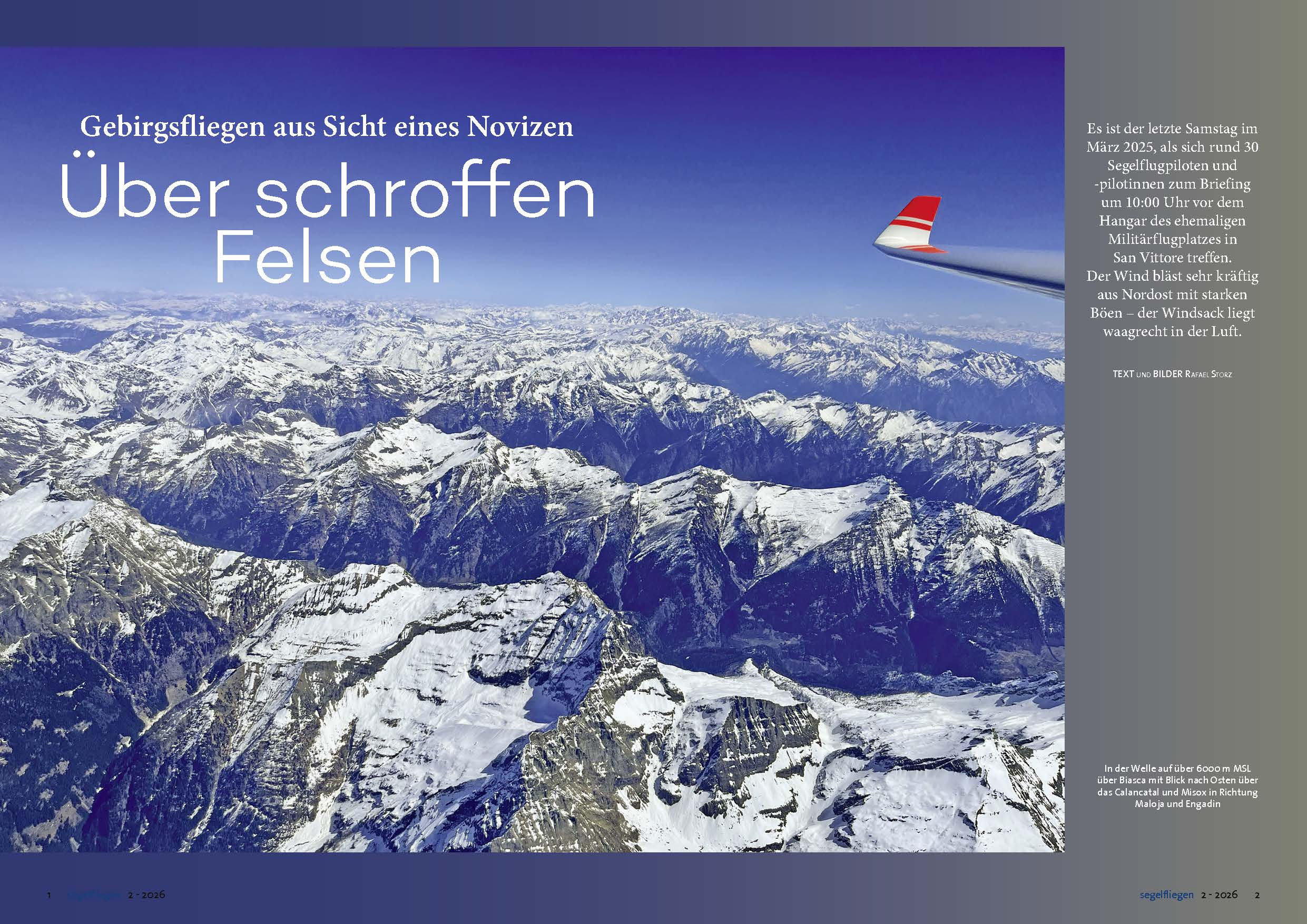 Diesmal starten wir gleich mit einem Top-Thema: Wie erkenne ich gute Wetterlagen? In diesem ersten Teil geht es um die optimale Vorbereitung, um den Hammertag nicht zu verpassen. Wer einen Wandersegelflug plant, kann natürlich auch einfach mal drauflos fliegen und sehen wohin ihn die Thermik trägt oder solange suchen, bis man den richtigen Weg findet und dann auch ungefähr da ankommt, wohin man wollte. Unsere beiden Flugberichte zeigen wie beides ein tolles Erlebnis werden kann. Manchmal weckt ja schon das erste Flug-Erlebnis die Leidenschaft, so wie bei einer jungen Pilotin in Kanada, die über ihre Ausbildung erzählt. Können ist natürlich auch dann gefragt, wenn man mal kurz kopfsteht: beim Kunstflug vor der spektakulären Kulisse von Eiger, Mönch und Jungfrau. Atemberaubend ist es auch im hohen Norden, wo man im Vågå Wave Camp in extremer Höhe (und Kälte) einmalige Ausblicke genießt. Klimatechnisch das Gegenteil, nämlich einer Hitzewelle mussten die Teams der 20-m-Doppelsitzer-Klasse in Brandenburg trotzen – aber sie hatten dennoch Spaß. Den bieten auch Flüge in L’Aquila in Mittelitalien, wo man zudem bei einem Flug zwei Meere gleichzeitig bestaunen kann, vielleicht beim nächsten Flieger-Urlaub? Aber wie immer: Safety first, diesmal stellen wir euch das neue Power FLARM Flex vor und in unserer Rubrik „Gewusst wie“ geht es um Grundlagen, Risiken und Pilotenfehler bei der Startunterbrechung. Wir bleiben beim Start und zwar an der Winde und optimieren ihn indem wir den Einfluss der Seillänge auf die Ausklinkhöhe genauer untersuchen. Ein bisschen Technik haben wir auch, einmal schauen wir uns an, wie moderne Windmesstechnik die Thermik sichtbar macht und dann werfen wir einen Blick auf die Entwicklung von Segelfluginstrumenten. So, dann dürfen Sie sich bei unserer Kolumne wieder ein wenig entspannen – und ein bisschen träumen, von der kommenden Saison oder von Afrika und von vielen wunderschönen Flügen. Und jetzt: hier geht’s zur aktuellen Ausgabe!